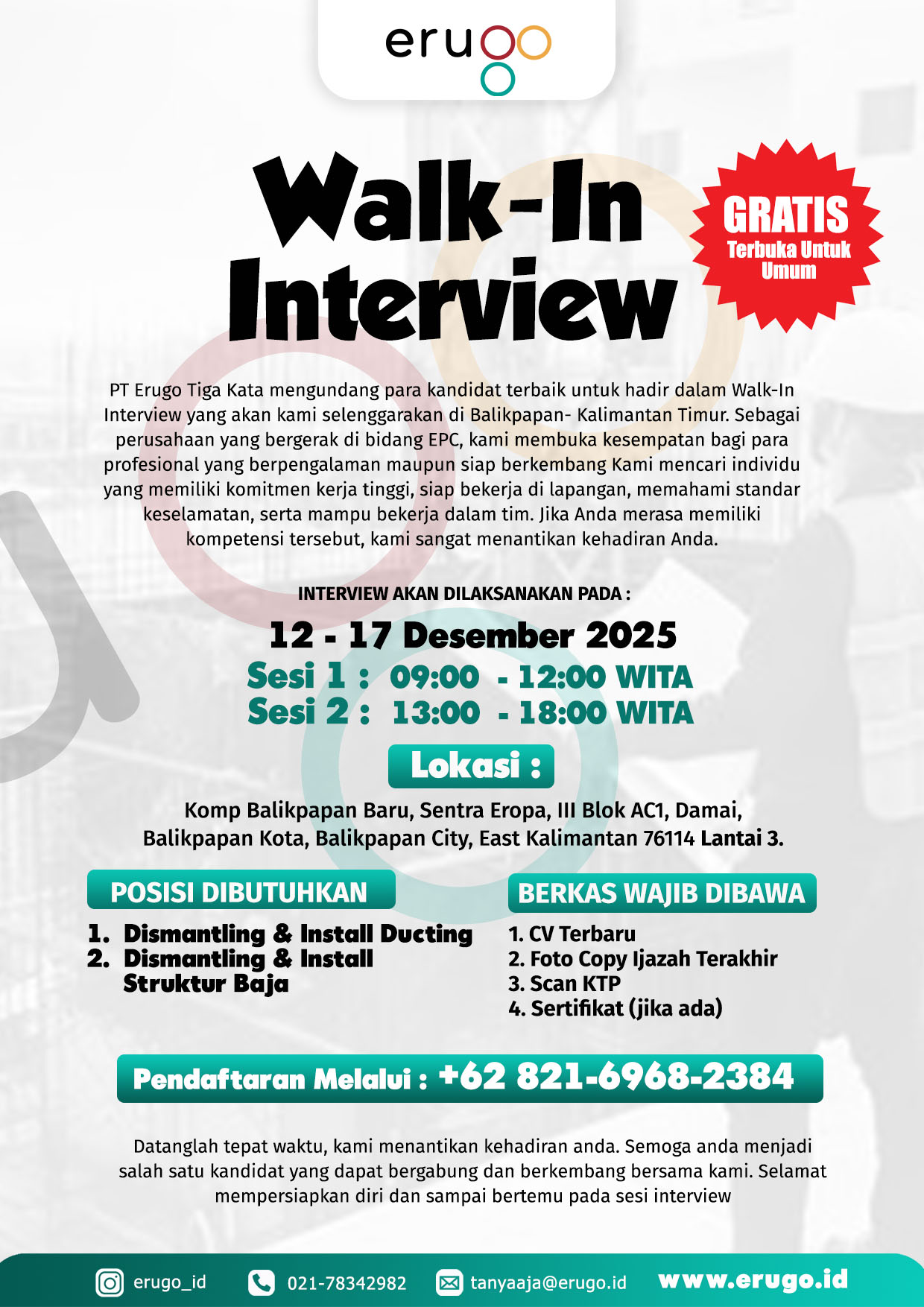 Kami memberikan kesempatan kepada para tenaga profesional untuk bergabung bersama kami dengan berbagai macam posisi yang tersedia Walk-In Interview (Balikpapan - Kaltim) Your name Your email Subject Your message (optional) upload file pdf Civil Quality Control Your name Your email Subject Your message (optional) upload file pdf Dismantling & Install Ducting Your name Your email Subject Your message (optional) upload file pdf Dismantling & Install Struktur Baja Your name Your email Subject Your message (optional) upload file pdf Site Manager Your name Your email Subject Your message (optional) upload file pdf Cathodic Protection Your name Your email Subject Your message (optional) upload file pdf Rope Access Your name Your email Subject Your message (optional) upload file pdf Staff Project Your name Your email Subject Your message (optional) upload file pdf Painter Your name Your email Subject Your message (optional) upload file pdf Sales Your name Your email Subject Your message (optional) upload file pdf Welder Your name Your email Subject Your message (optional) upload file pdf Engineer Your name Your email Subject Your message (optional) upload file pdf Fireproofing Your name Your email Subject Your message (optional) upload file pdf Quality Control Your name Your email Subject Your message (optional) upload file pdf HSE Engineer Your name Your email Subject Your message (optional) upload file pdf Project Control Your name Your email Subject Your message (optional) upload file pdf Procurement Your name Your email Subject Your message (optional) upload file pdf Project SPV Your name Your email Subject Your message (optional) upload file pdf